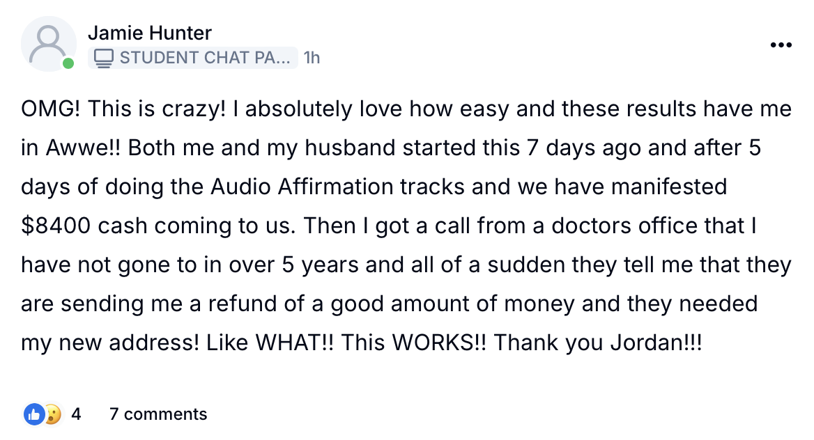 Our student Jamie just manifested $8,400 after listening to the tracks!