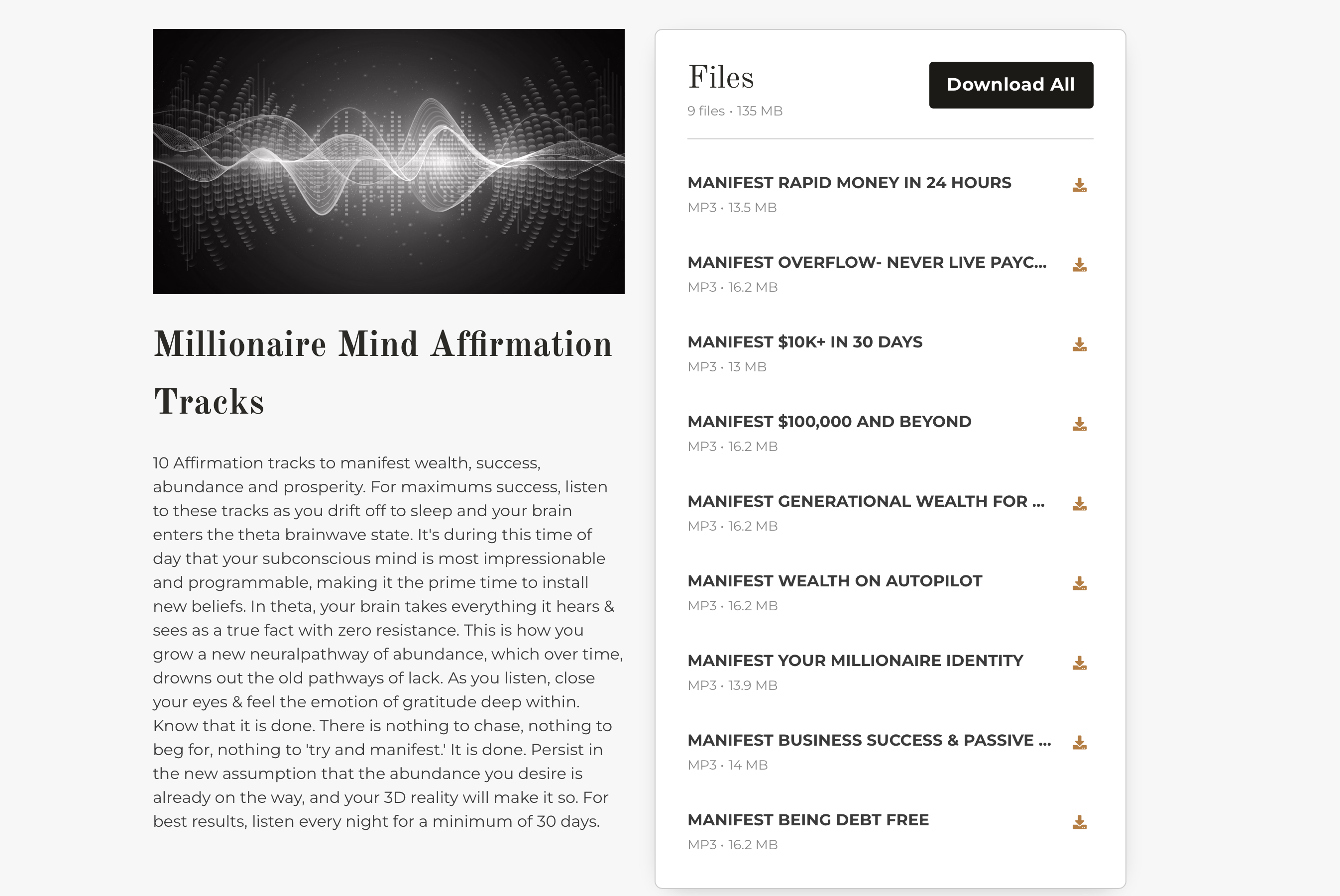 This is a life changing set of 10 neuroscience-backed, subconscious reprogramming audios created to actively rewire the brain for wealth, success, opportunity, and overflow. I created and recorded every single track myself from scratch, ZERO CHAT GPT OR AI OF ANY KIND. Each track is layered with theta and delta brainwave frequencies plus subconscious affirmations proven by neuropsychology to shift mental wiring from scarcity to abundance.